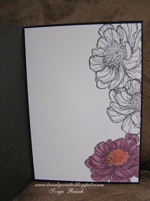 De binnenkant van de kaart dezelfde bloem gestempeld en de onderste alleen ingekleurd met Rich Razzleberry en Calipso Coral.